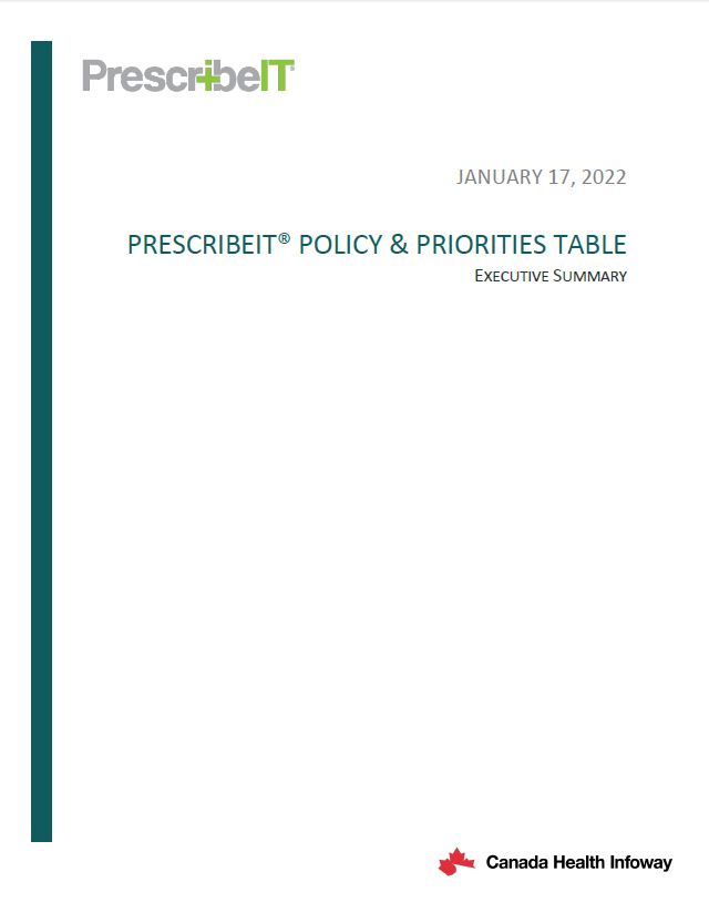 In 2021, Canada Health Infoway launched a large-scale, pan-Canadian stakeholder engagement initiative on e-prescribing priorities, in effort to inform PrescribeIT’s future potential business and functionality roadmap. The top ten e-prescribing priorities that were determined through this effort were presented to a broad group of stakeholders at the inaugural PrescribeIT® Policy and Priorities Table, which was held virtually on November 30, 2021. The overall findings and approach from this effort have been compiled in the ‘PrescribeIT® Policy and Priorities Table Executive Summary’ document. We look forward to continuing to work with the stakeholder community on this effort, and thank all who have participated in these engagement efforts.